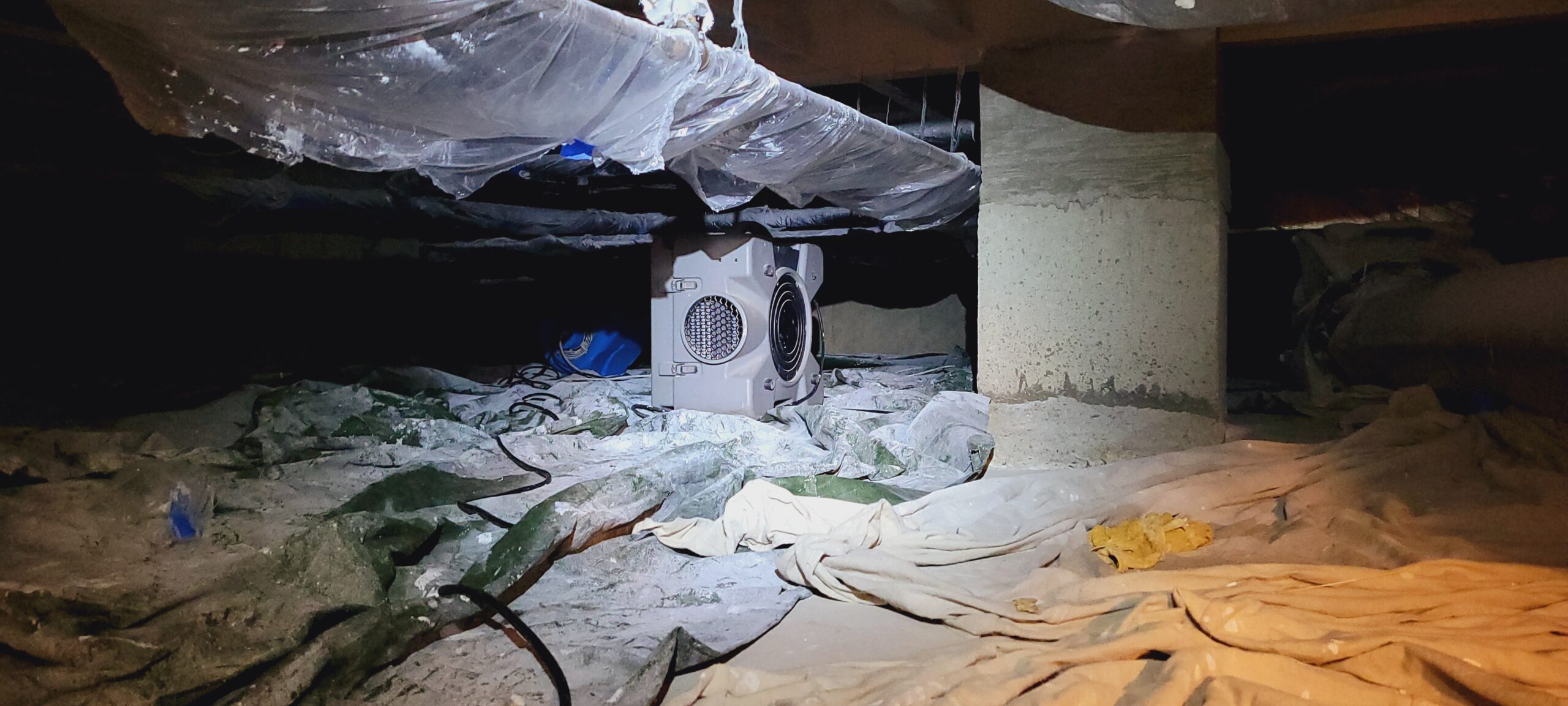 A crawl space showing remediation going on and how all services are protected and the space is ventilated